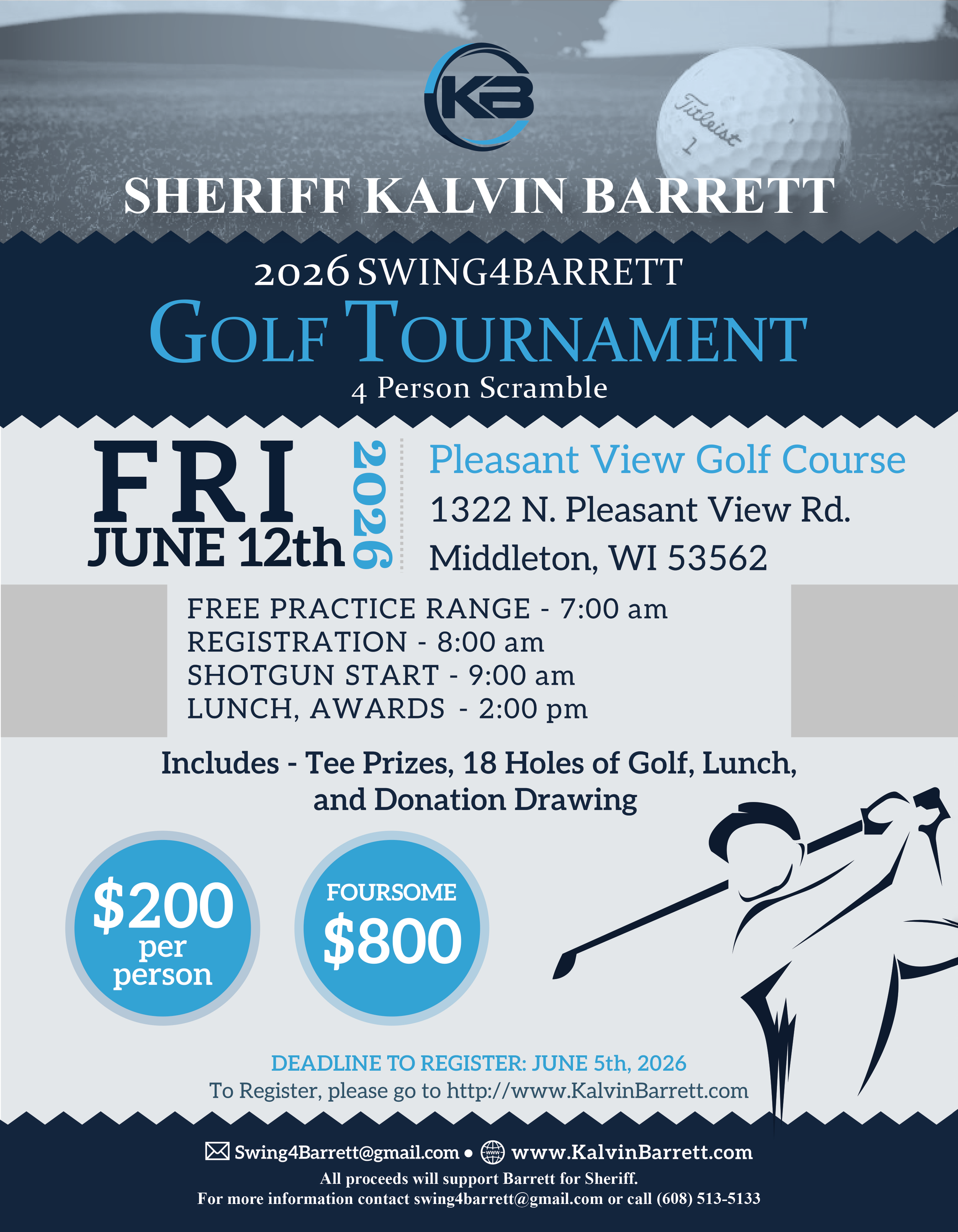 Join us for the 2026 Swing4Barrett Golf Tournament! On Friday, June 12th, we're teeing off at Pleasant View Golf Course in Middleton for a 4-person scramble to support Sheriff Kalvin Barrett's re-election campaign. Registration is $200 per person or $800 for a foursome, and includes tee prizes, 18 holes of golf, and a lunch buffet.